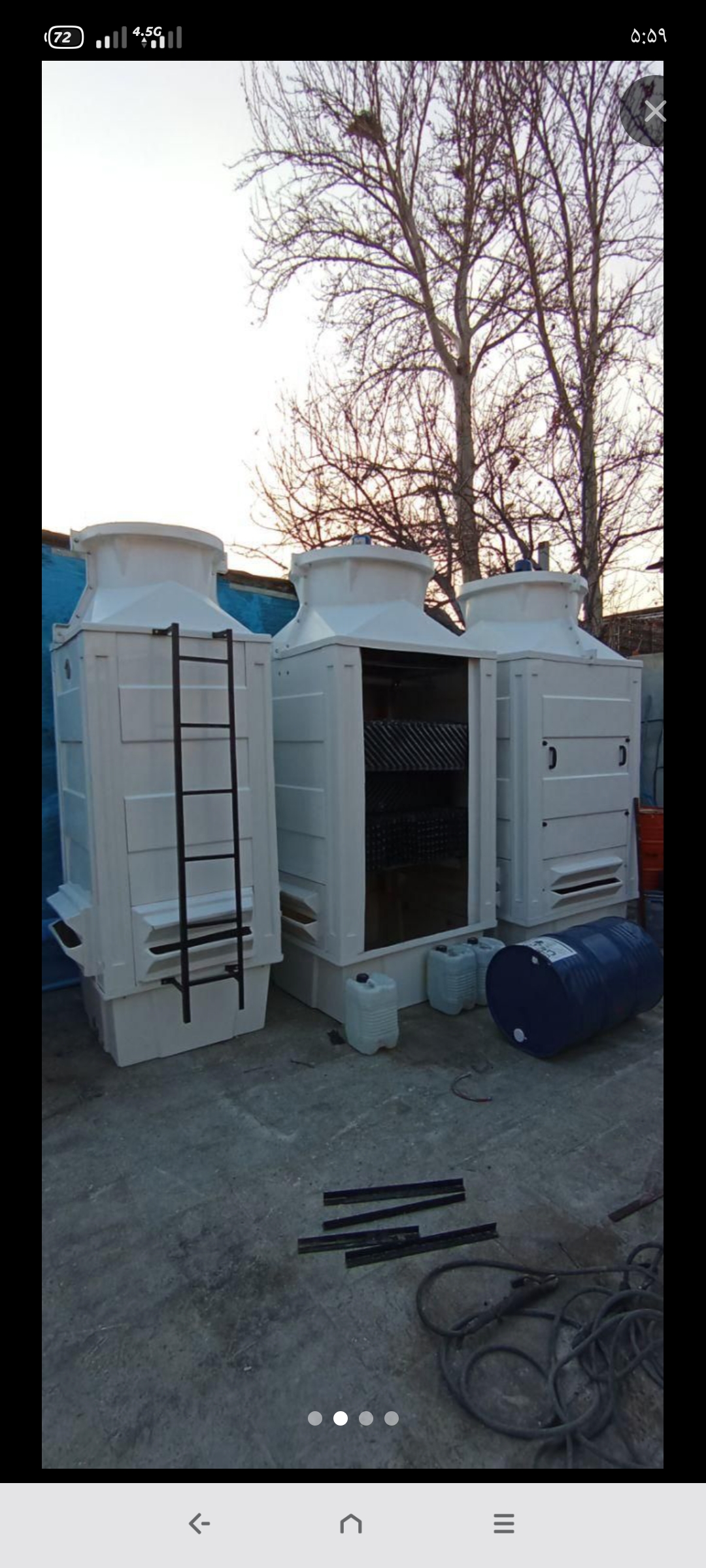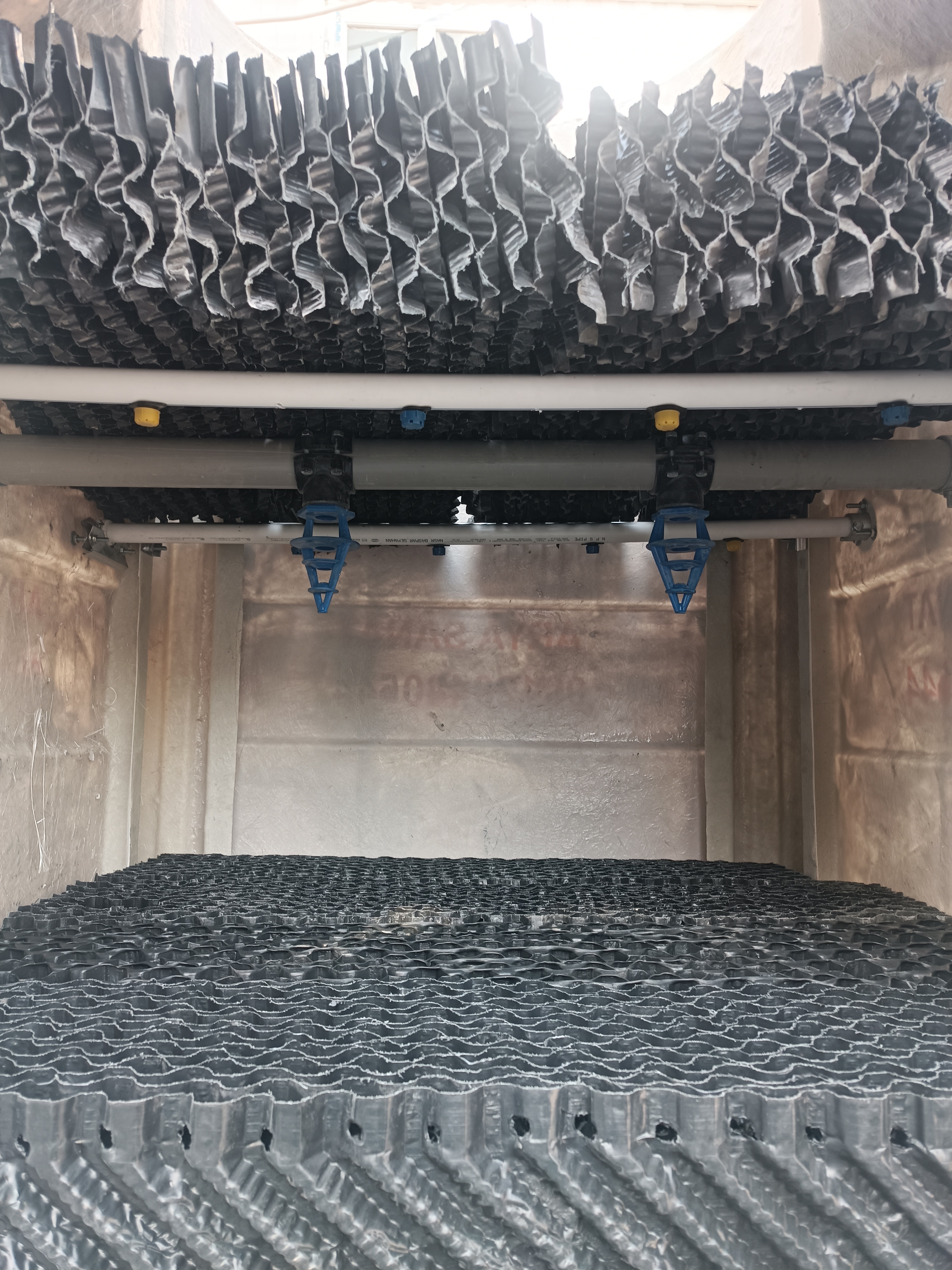 برج خنک کننده دارای ساید گلاس برای بازدید داخل برج پکینگ نت اسپلش مشگی دو ردیف با متریال بالا ساپورتی اف ۴۷ گالوانیزه دارای پروانه پلی امید شش پر
